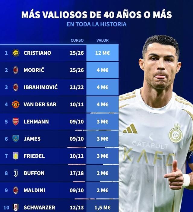 排在第1位的是葡萄牙巨星C罗,现如今仍是41岁的他仍然领有1,200万欧的官方身价,这确乎特出夸张。在绝大大齐球星40岁早已退役的前提下,C罗还粗略以这样高的身价出当今绿茵场上,确乎了不得。况且他现如今还领有很高的进球效果。不得不说,他被称为顶级巨星是有原因的。同期计划到C罗目下有一个做事糊口1000球的方案,因此异日两年这位葡萄牙时尚仍然不会退役。