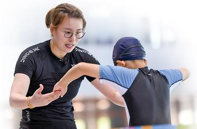 近日,傅园慧在给小一又友上公益游水课。胡建强摄(影像中国)