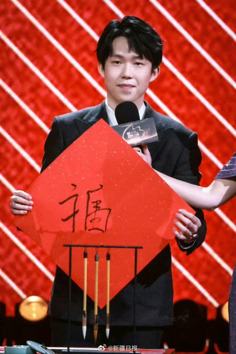 大头还一展才艺,用羊毫写了一个福字,并祝公共一齐顺风,福运满堂。